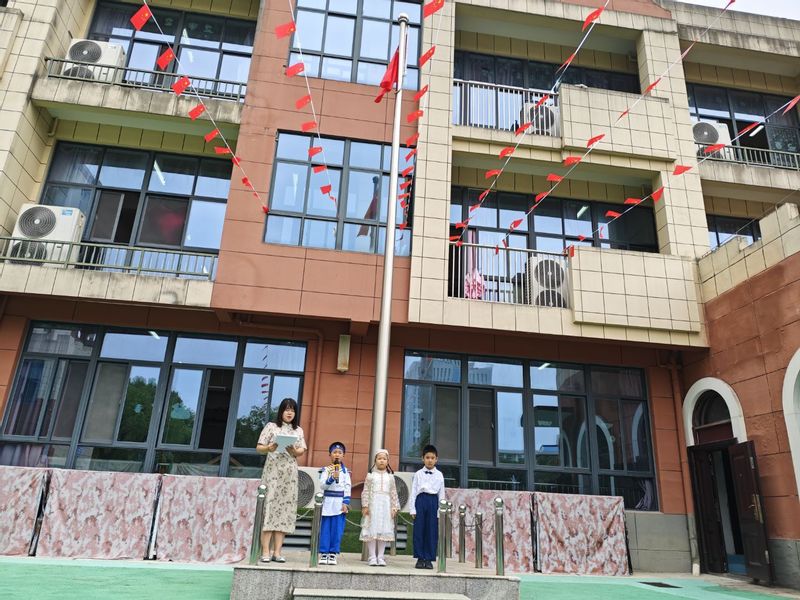 上午8点30分,校园里已洋溢着浓厚的节日氛围。小朋友们身着各具特色的民族服饰,在老师与家长的带领下齐聚操场,参加庄严的升旗仪式。伴随着激昂雄壮的《义勇军进行曲》,鲜艳的五星红旗冉冉升起,稚嫩童声与教师歌声交织,孩子们挺直小小的身姿,仰脸行注目礼,满怀敬意注视着国旗高高飘扬。国旗下,大班小朋友们用稚嫩的语言诉说着对祖国妈妈的祝福与热爱,以及对双节的期待。