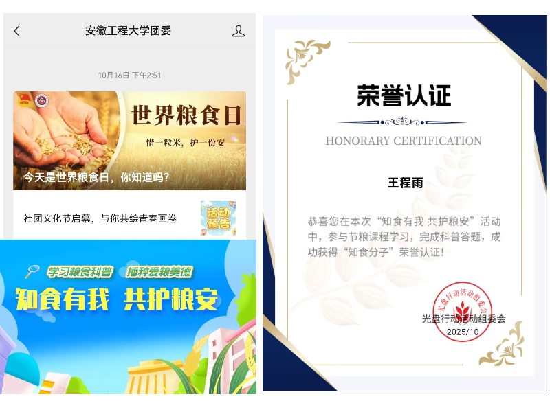 粮食节约人人有责,青春誓言守护粮安。根据安排,在10月16日世界粮食日当天,校学生伙食管理委员会在校团委微信公众号发布专题推文,开展线上科普宣传;在第二课堂发布“知食有我,共护粮安”线上主题活动,500个名额一抢而空,报名参加的同学通过学习科普视频、参与答题获证书等形式,学习、参与、传播节约粮食的理念。环工241的王程雨表示,“通过参加本次线上活动,不仅学习了粮食科普知识,获得了证书学时,更加让我深刻认识到,粮食节约人人有责,以敬畏之心珍视粮食,以行动之力守护安全。”