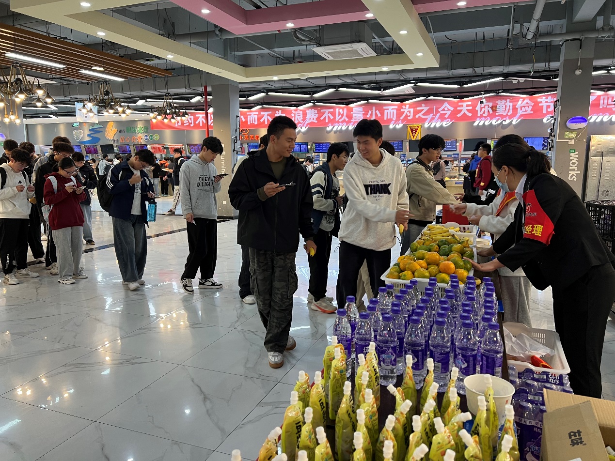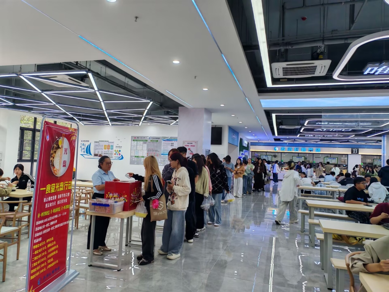 食堂活动精彩纷呈,光盘行动蔚然成风。活动期间,各食堂举办了系列趣味盎然的主题活动,师生凭“光盘”即可参与。在松庐餐厅,光盘即可参加趣味套圈。在一食堂,光盘即可参加抽奖。在二食堂、三食堂和东区食堂,光盘即可领取小礼品,奖品有牛奶、水果、饮料、小零食、纸巾、食堂优惠券、洗衣液、定制礼品等,累计有3万余人次参与。数科241杨莹莹表示,“食堂举办的光盘抽奖活动既有意义又有趣,增强我们爱粮节粮意识,既内化于心,又外化于行,拒绝‘剩’宴,争做‘光’荣使者。”