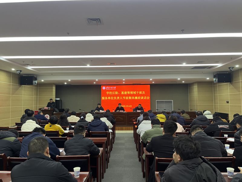 为巩固拓展中央八项规定精神学习教育成果,持续强化党风廉政建设,切实增强后勤基建等领域党员干部廉洁自律意识,2026年1月14日下午,学校在图书馆202会议室组织召开后勤基建领域节前集体廉政谈话会。校党委常委、副校长张开炳出席会议并开展集体廉政谈话,校纪委副书记、纪委办主任郭广春作廉政教育并通报典型案例。安全管理处、后勤保障处、校园基本建设办公室和国际工程师学院校区管委会四个部门科级及以上干部和在校服务单位代表共55人参加会议。会议由后勤党总支书记、后勤保障处处长李敬华主持。